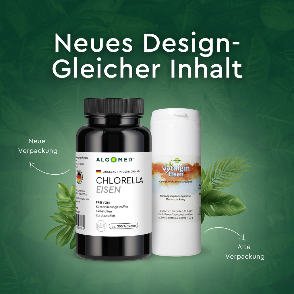 Für ALGOMED® Eisen wird Chlorella mit einem ausgeklügelten Verfahren so kultiviert, dass sie auf natürliche Weise besonders viel Eisen aufnimmt. Der Eisenanteil ist dabei mehr als doppelt so hoch wie bei den normalen ALGOMED® Chlorella Produkten und bietet somit eine rein natürliche, vegane Eisenquelle als Nahrungsergänzung an.