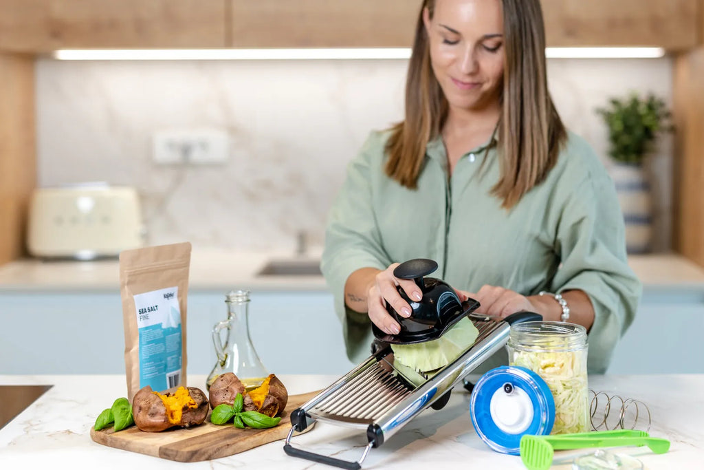 Der MANDOLIN SLICER ist ein hilfreiches Küchengerät aus solidem Edelstahl, um Ihr Gemüse und Früchte in perfekte Streifen und Scheiben für die Fermentation zu schneiden..